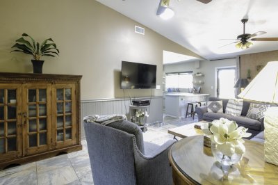 Spacious 3-Bedroom Townhome with Scenic Views! This well-appointed townhome features 3 bedrooms and 2 full baths, including a luxurious master suite with walk-in closet, Roman tub, and snail shower under a skylight. Enjoy privacy with a split floor plan, an office-ready second bedroom (twin bed available for longer stays), and a private third bedroom. Relax on two gated patios, and cook with ease in a fully stocked kitchen. Includes a one-car garage and ample indoor and outdoor seating.