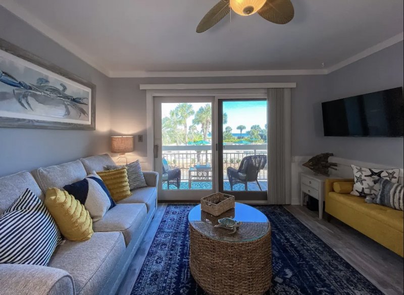 This charming and cozy condo is updated with fun beachy decor and comfortable furniture, making it an excellent option for a relaxing beach getaway! The kitchen and living room are designed in an open-concept fashion. The dining area seats 6 comfortably, with extra seating at the kitchen counter. The color palette is lovely in neutral shades with hints of coastal colors! There is a balcony off the living room and master bedroom that offer partial views of the beach.