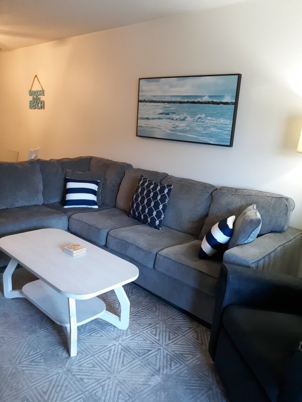 This beautiful condo is beachfront with great views. It has recently been updated with fresh paint and new furniture. Our condo features a large, inviting living and dining area that overlooks the Gulf with stunning views! There is plenty of room here for family and friends to gather for a nice meal or some serious game or movie watching on the flat-screen TV.