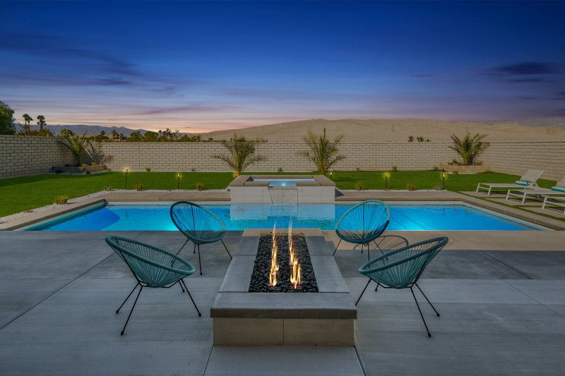Escape to a private retreat where golf course fairways, mountain peaks, and a private pool and spa create the perfect sweeping backdrop for your desert stay. This beautifully designed 2-bedroom, 2-bathroom home features its own pool and spa, offering resort-style living in a vibrant 55+ community. Inside, the open-concept living area invites you to relax with a cozy fireplace, waterfall, smart TVs, and floor-to-ceiling windows showcasing sweeping views from nearly every room. A full-size Murphy bed in the living room provides extra sleeping space for guests.