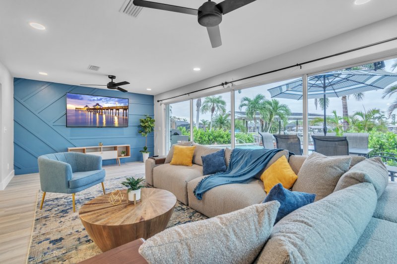 As you enter the front door, you'll be greeted by the cozy café nook and living room featuring open-concept living with a breathtaking panoramic view of the beautiful infinity pool area overlooking the largest canal on the island. The kitchen features newly updated cabinets, counters, stainless steel appliances, and modern island area with stools. A private patio area is accessed through large sliding glass doors from the living room. The pool features a relaxing water fountain, an outdoor dining area, and lounge chairs for sun bathing. Beyond the pool, enjoy watching the dolphins and manatees on the tranquil boat dock area with deck for seating and a motorized boat lift for vessels up to 16,000 pounds.