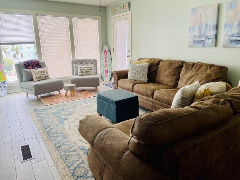 This charming and cozy condo is perfect for a small family or a couple wanting to enjoy a much-needed getaway at the beach! This condo is decorated in beautiful, cheery beach colors, making for a fun environment to enjoy your time at the beach. This unit is located across the street from the Gulf. However, you can still enjoy the views of the beach and the beautiful white dunes from your balcony.