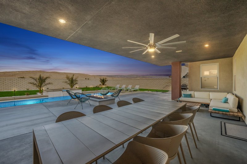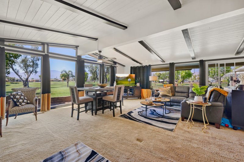 Escape to a private retreat where golf course fairways, mountain peaks, and a private pool and spa create the perfect sweeping backdrop for your desert stay. This beautifully designed 2-bedroom, 2-bathroom home features its own pool and spa, offering resort-style living in a vibrant 55+ community. Inside, the open-concept living area invites you to relax with a cozy fireplace, waterfall, smart TVs, and floor-to-ceiling windows showcasing sweeping views from nearly every room.