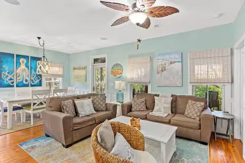 This Beach Getaway is the perfect place to kick your shoes off, relax, and enjoy the sunshine! This oasis is only a 2-minute car drive to Cherry Grove Beach and is located in North Myrtle Beach. This home offers a beautiful coastal design, ample space to play, unwind, and visit the Atlantic Ocean. Enjoy a short walk to Boulineau’s Food store, Swimwear stores, or play Mini Golf and rent our Golfcart (fee) for your stay. This Golf cart is registered and can be parked for free near the beach.