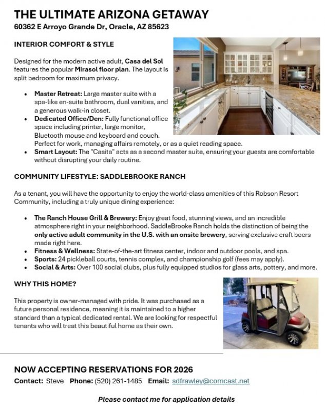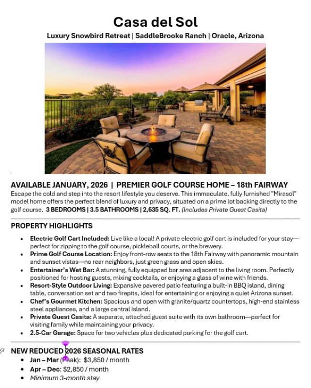 Available January, 2026: Luxury 18th Fairway Home w/ Casita & Golf Cart Included. Premier Views at SaddleBrooke Ranch.