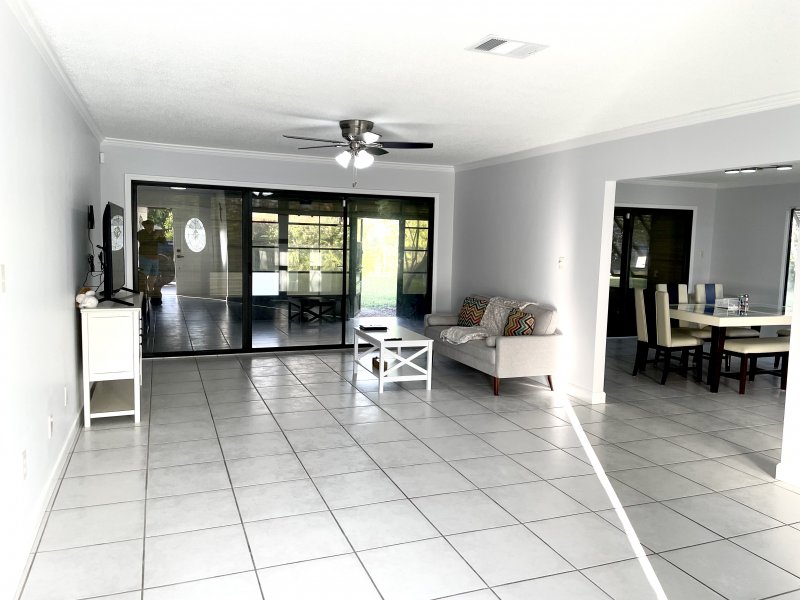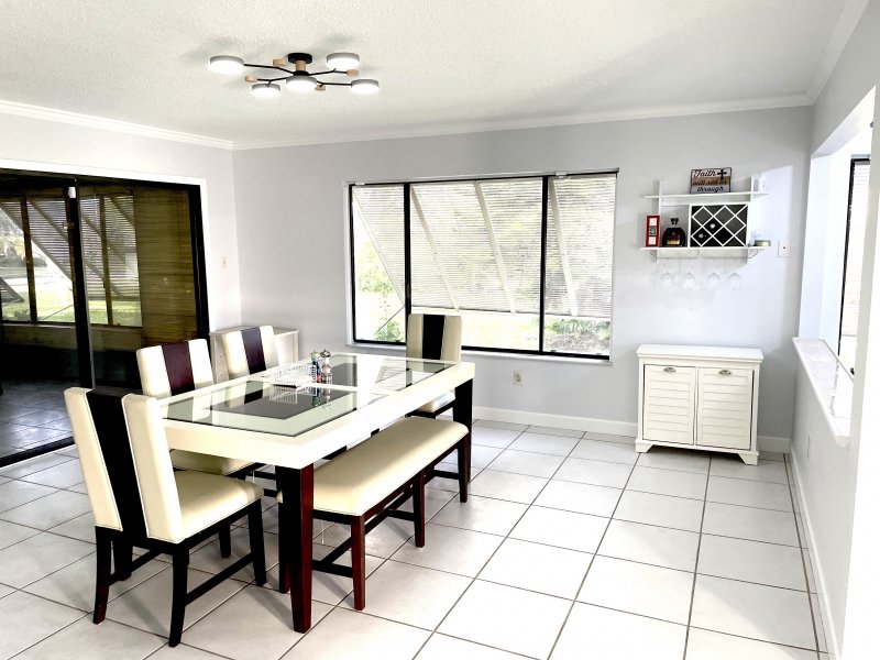Offering 1,868 sq ft of living space, this home features a thoughtfully designed layout that includes a formal living room, a separate family room, a formal dining room, and a spacious kitchen equipped with a new range and refrigerator. The expansive screened lanai provides a perfect spot for outdoor relaxation or entertaining.